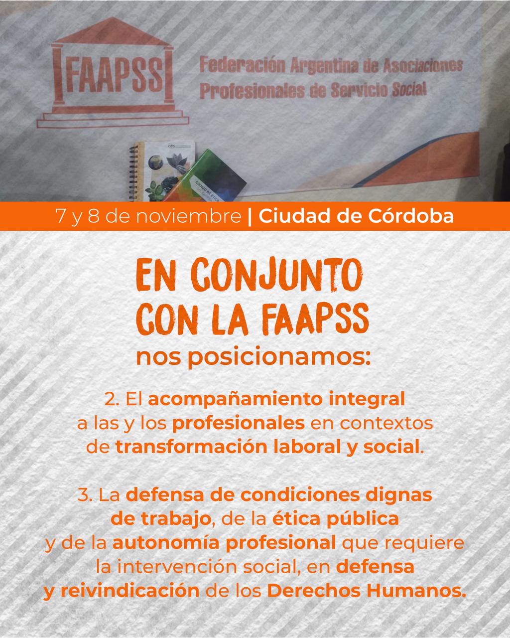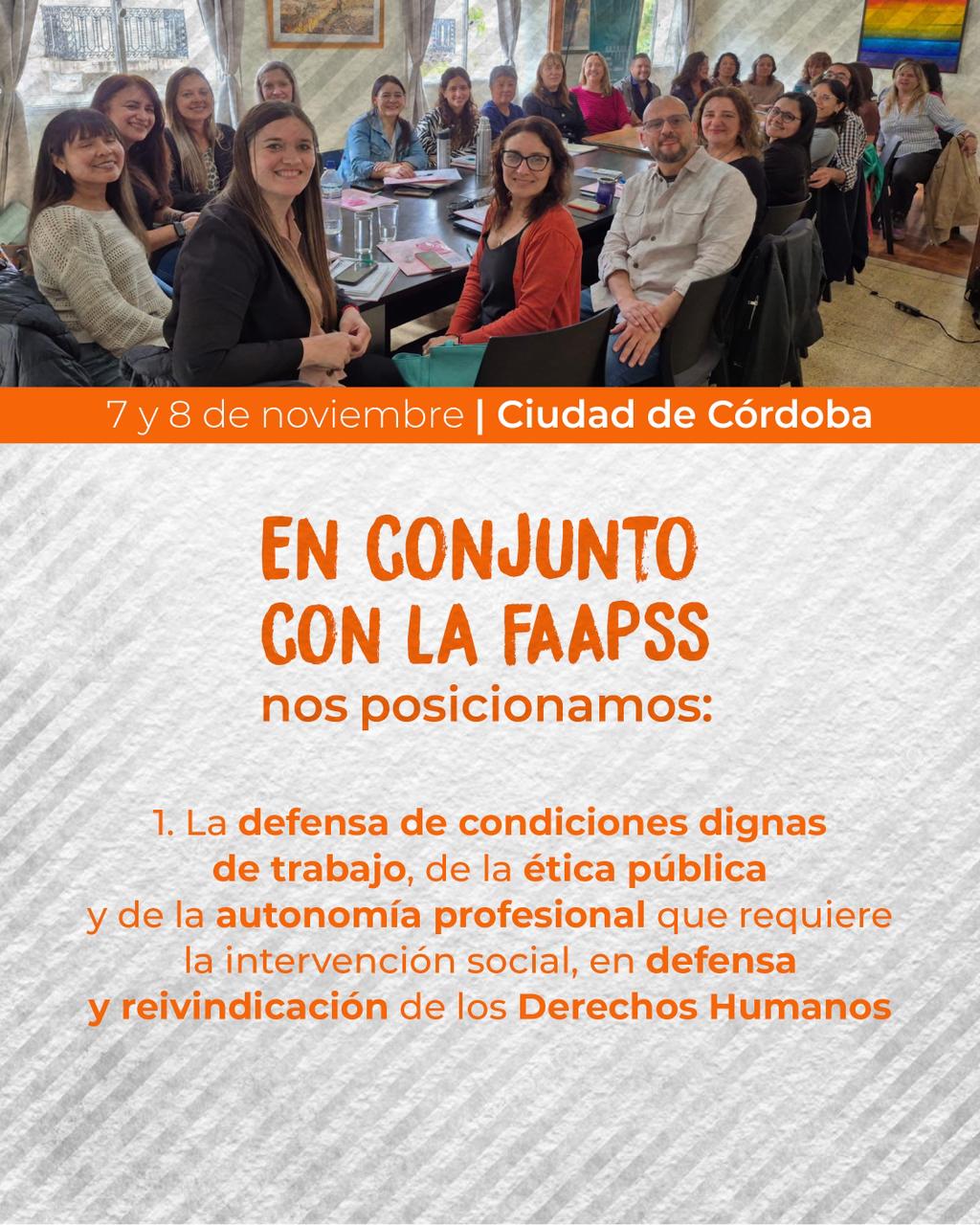 El pasado 7 y 8 de noviembre, en la ciudad de Córdoba, Julia Méndez -presidenta del CATSPBA- y Mirta Rivero -delegada- participaron de la Junta de Gobierno de la Federación Argentina de Asociaciones de Profesionales de Servicio Social (FAAPSS) en donde se abordaron diversos temas centrales de los Colegios/Consejos profesionales de cada provincia, así como, las acciones conjuntas con otras organizaciones profesionales y académicas -FAUATS, FITS, CGP-.